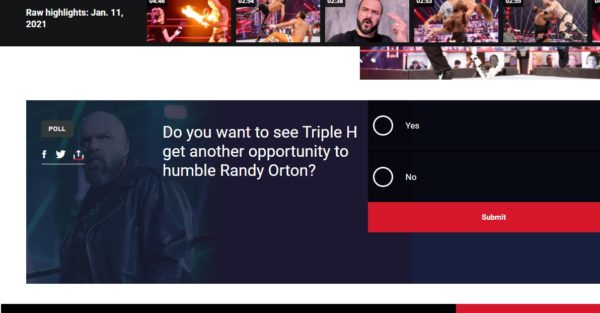 On WWE’s website, the company is asking fans if they want to see Triple H get another chance to wrestle Randy Orton. This comes after their match on RAW didn’t have a proper finish. Here is the poll on WWE’s website: